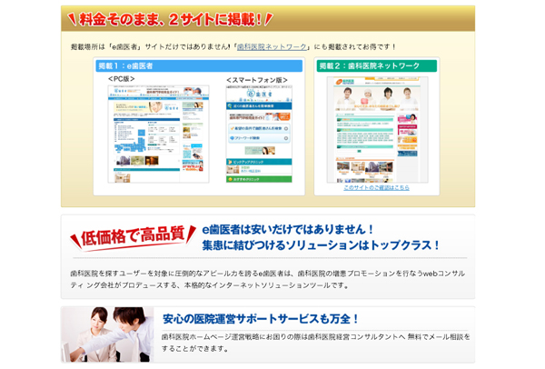 歯科医院を探すユーザーを対象に圧倒的なアピール力を誇るe歯医者は、歯科医院の増患プロモーションを行なうwebコンサルティ ング会社がプロデュースする、本格的なインターネットソリューションツールです。